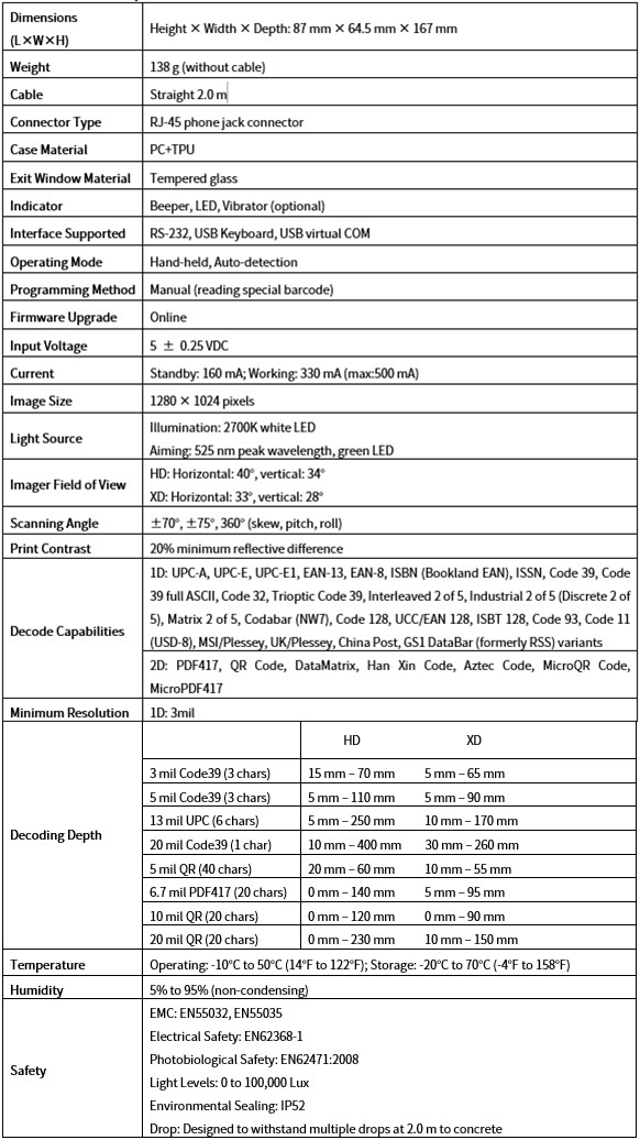 MD7900 產品特色卓越的DPM碼識讀能力,輕鬆應對各種電子製造應用場景- 超高工業防護的結構設計,可承受2米高的反復跌落測試- 採用影像式自動感應技術,可在免持與手持兩種模式之間自由切換- 人性化的照明和對焦設計,帶來舒適便捷的掃描體驗 Specifications Gallery