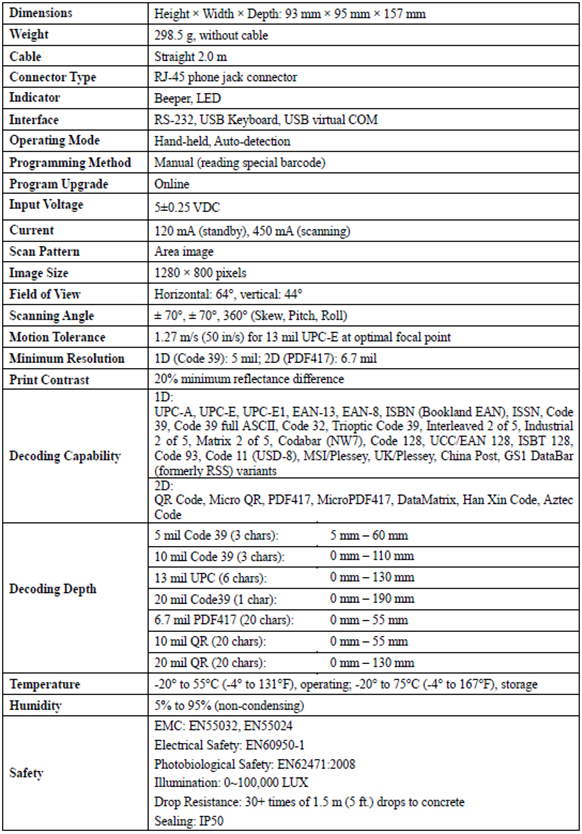 - Green aimer, bicolour LED indicator and loud sound deliver comfortable and convenient scanning experience.